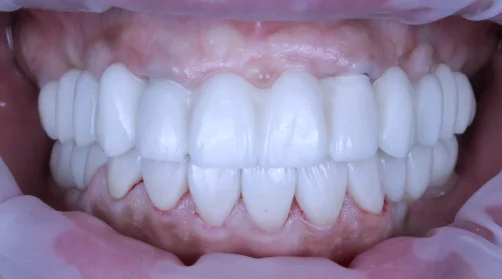 A dental implant is an artificial tooth root that replaces one or several missing teeth. The inner part looks like a screw and is made of a biocompatible titanium alloy, and the outer part is the prosthetic with the same appearance of a natural tooth. In time, the bone cells develop around the implant, reinforcing it into the jaw and fusing it with the surrounding bone.